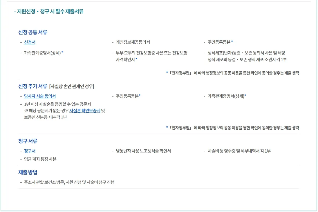 - 지원신청서, 주민등록등본, 가족관계증명서, 건강보험 확인서, 시술 확인서 등